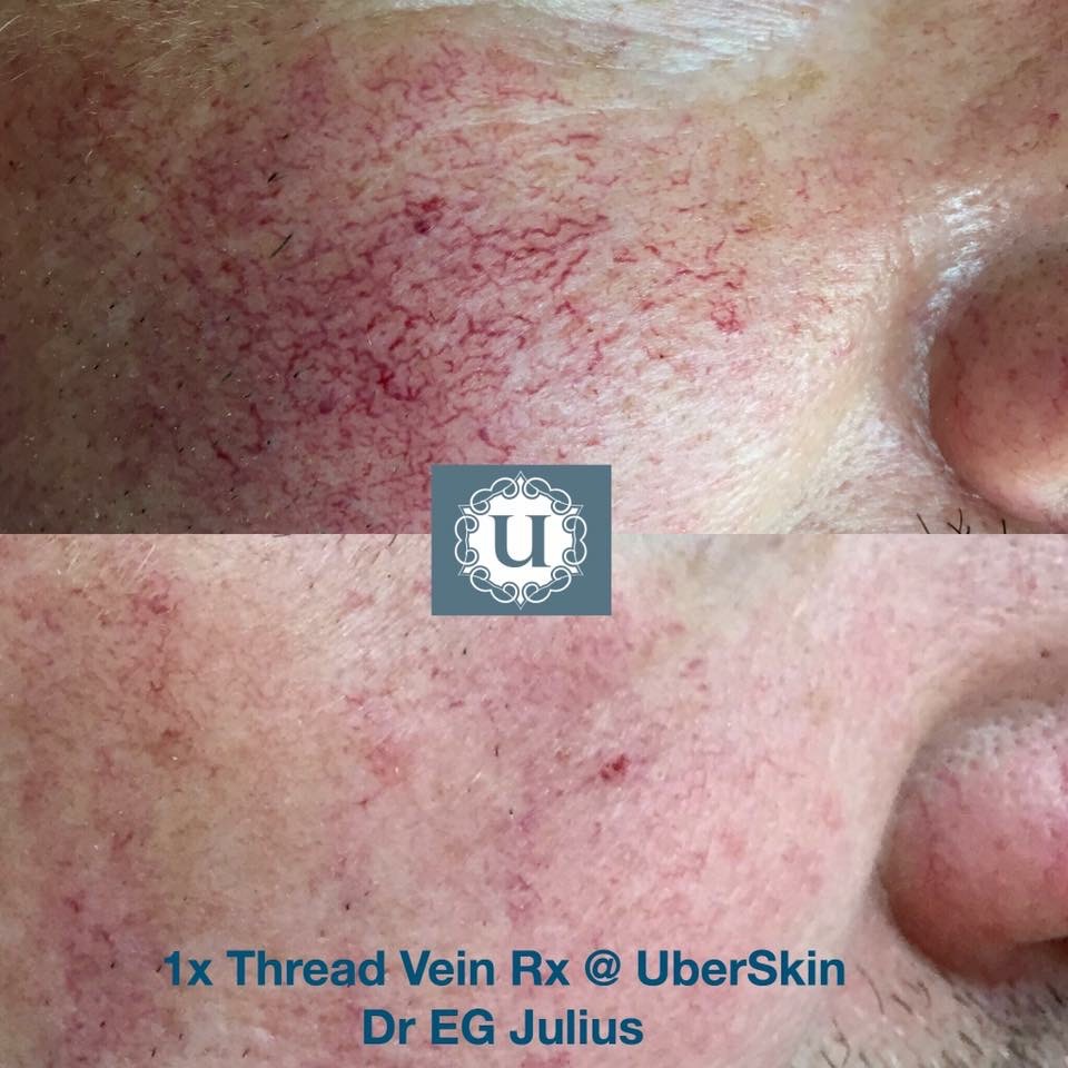 Facial thread veins tend to appear on the nose, cheeks and chin. It appears as red lines or clusters (spider veins) and can also be associated with Rosacea. Some patients may be unaware of thread veins they may have in their neck.